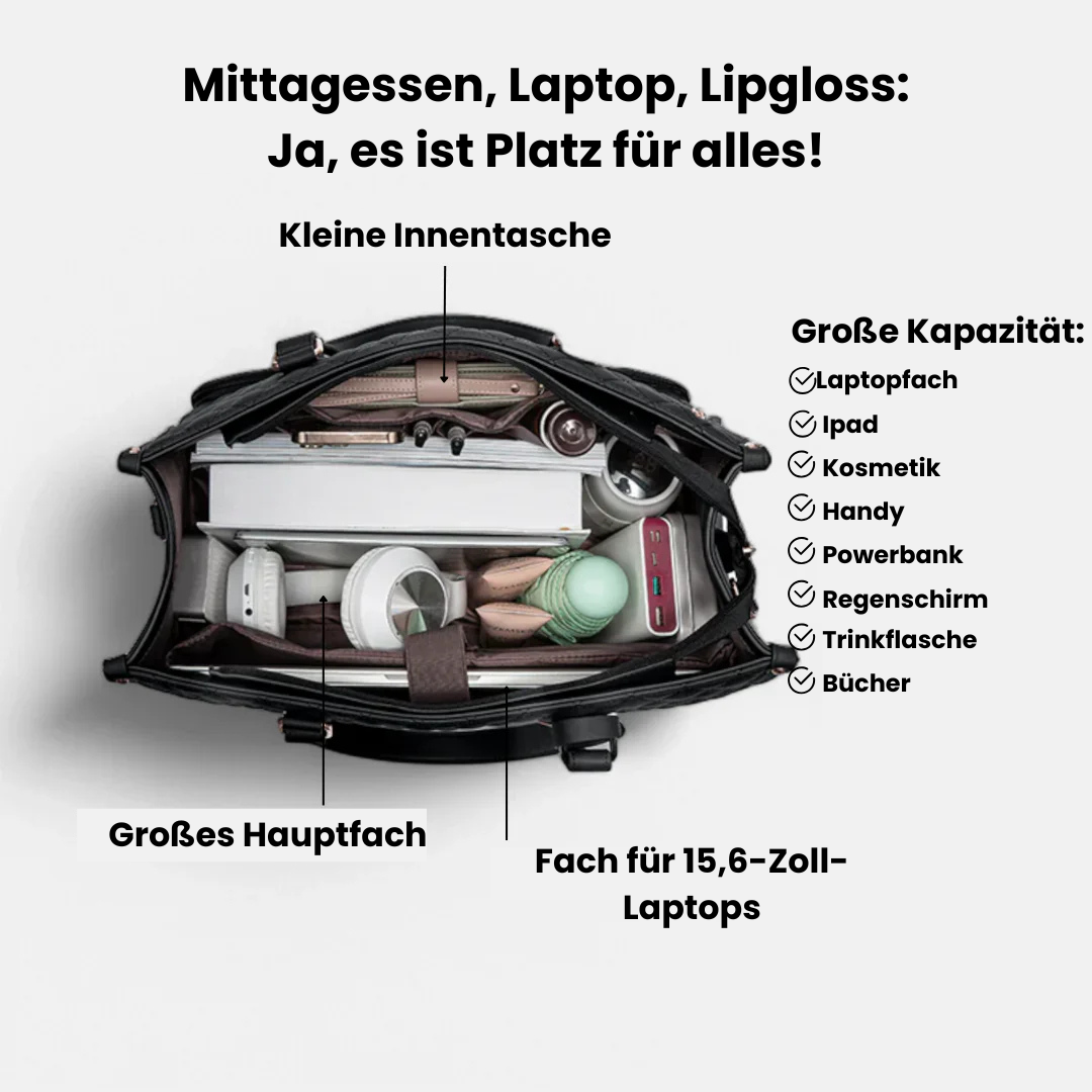 Diese stilvolle und funktionale 3-in-1-Tasche verfügt über ein Fach für einen 15,6-Zoll-Laptop, ein isoliertes Essensfach und mehrere geräumige Verstaumöglichkeiten, und das alles in einem modernen Design.